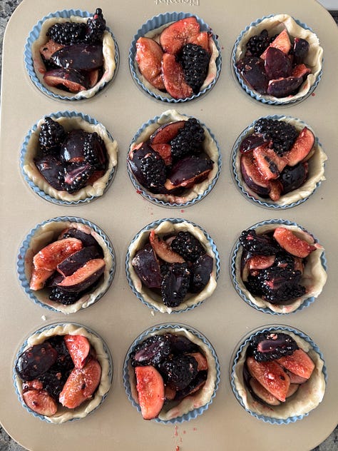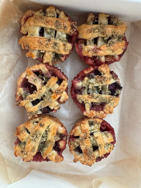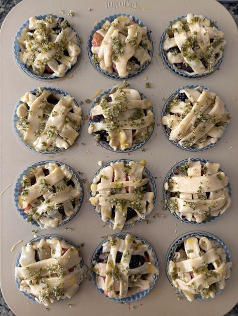 So, I cut the dough into small circles, placed them into muffin tins. Filled them with a mixture of blackberries, figs, and lemon zest. I sloppily cut the extra dough into lattice. My mother’s garden was overflowing with herbs and she always commented on the lemon verbena, what could you possibly do with lemon verbena? I finally fulfilled my prophecy, after many instances of claiming I would blitz some into a sugar, and topped the mini pies with lemon verbena sugar.