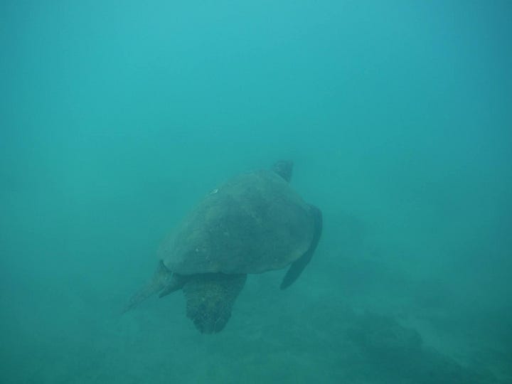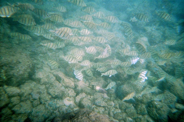 My grandfather and I used to walk backwards into the water while tucking our toes into fins and gliding masks onto our faces. Submerging underwater tuned out all of the noise. We entered our own universes snorkeling, exploring coral reefs solo until I’d suddenly feel a tap on my shoulder, pointing to a turtle. I sometimes carried an underwater camera, half the time accidentally covering the lens with my thumb.